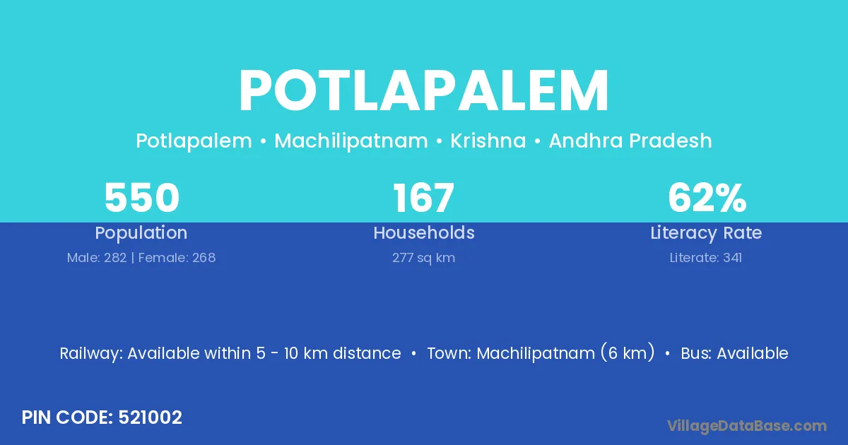 Machilipatnam (6 km) is the nearest town to Potlapalem village for major economic activities and is located approximately 6 km away.