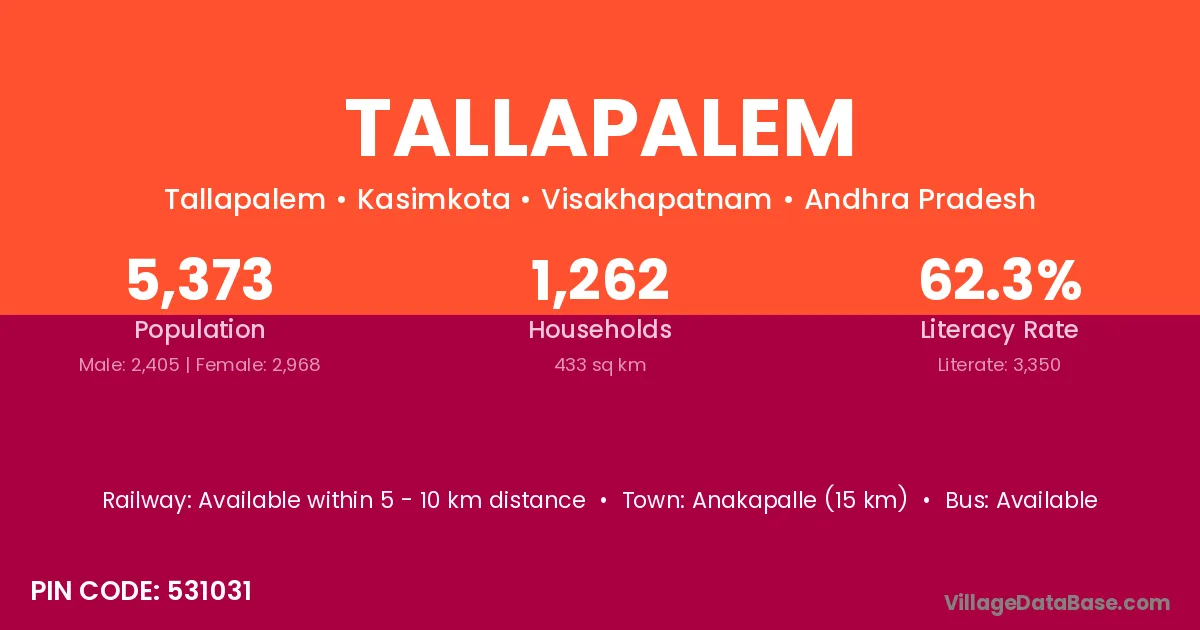 The literacy rate of Tallapalem village is 59.80%. Male literacy stands at 65.26% and female literacy at 54.10%.