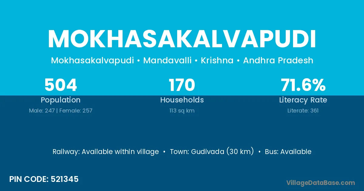 Mokhasakalvapudi village has a total population of 504 people, of which 247 are males and 257 are females.