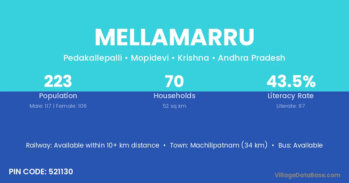 Machilipatnam (34 km) is the nearest town to Mellamarru village for major economic activities and is located approximately 34 km away.