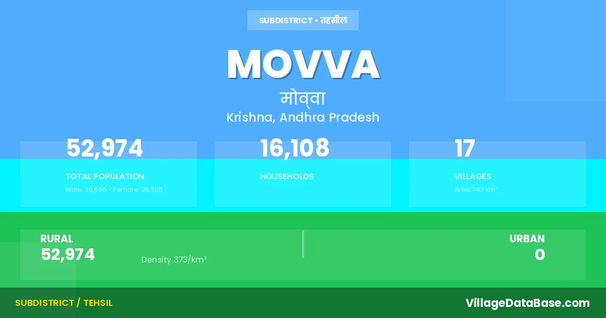 According to the 2011 census The total area of Movva Mandal is 142 km², with a population of 52974 people. The population density is 373 inhabitants per square kilometre, and there are approximately 16108 houses in the sub district.