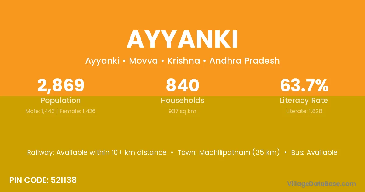Ayyanki village has a total population of 2,869 people, of which 1,443 are males and 1,426 are females.