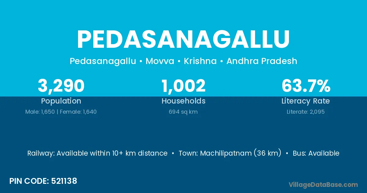 Pedasanagallu village has a total population of 3,290 people, of which 1,650 are males and 1,640 are females.