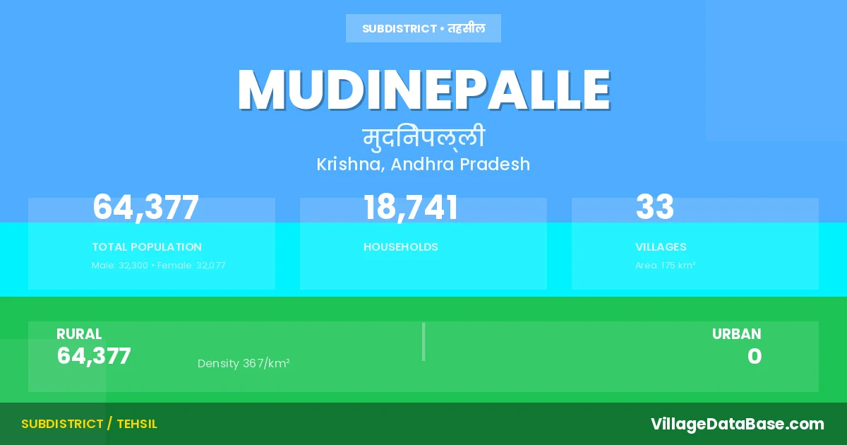 According to the 2011 census The total area of Mudinepalle Mandal is 175 km², with a population of 64377 people. The population density is 367 inhabitants per square kilometre, and there are approximately 18741 houses in the sub district.