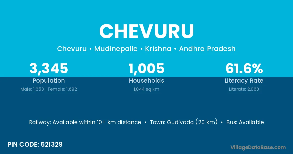 Gudivada (20 km) is the nearest town to Chevuru village for major economic activities and is located approximately 20 km away.