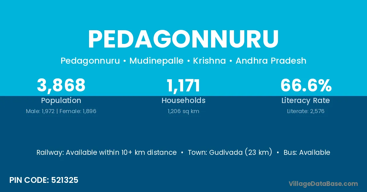 Gudivada (23 km) is the nearest town to Pedagonnuru village for major economic activities and is located approximately 23 km away.