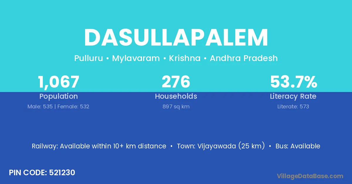 Dasullapalem village has a total population of 1,067 people, of which 535 are males and 532 are females.