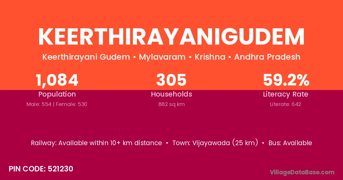Keerthirayanigudem village has a total population of 1,084 people, of which 554 are males and 530 are females.