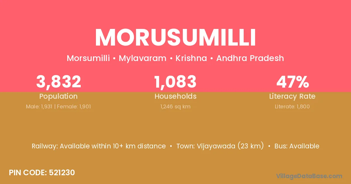 Vijayawada (23 km) is the nearest town to Morusumilli village for major economic activities and is located approximately 23 km away.