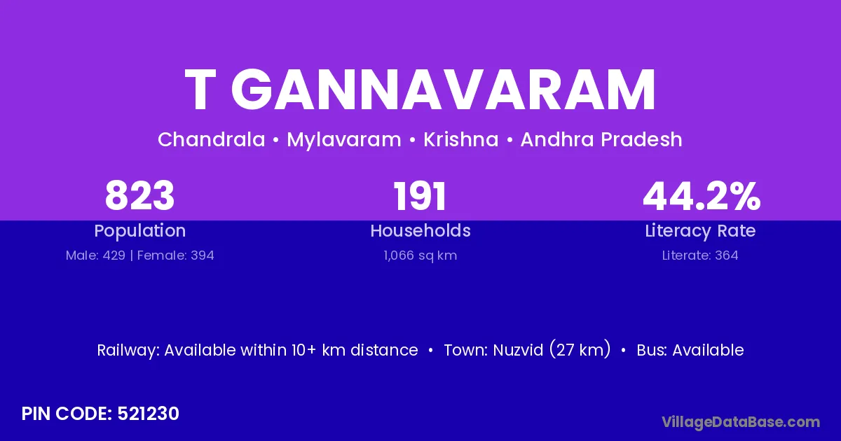 Nuzvid (27 km) is the nearest town to T Gannavaram village for major economic activities and is located approximately 27 km away.
