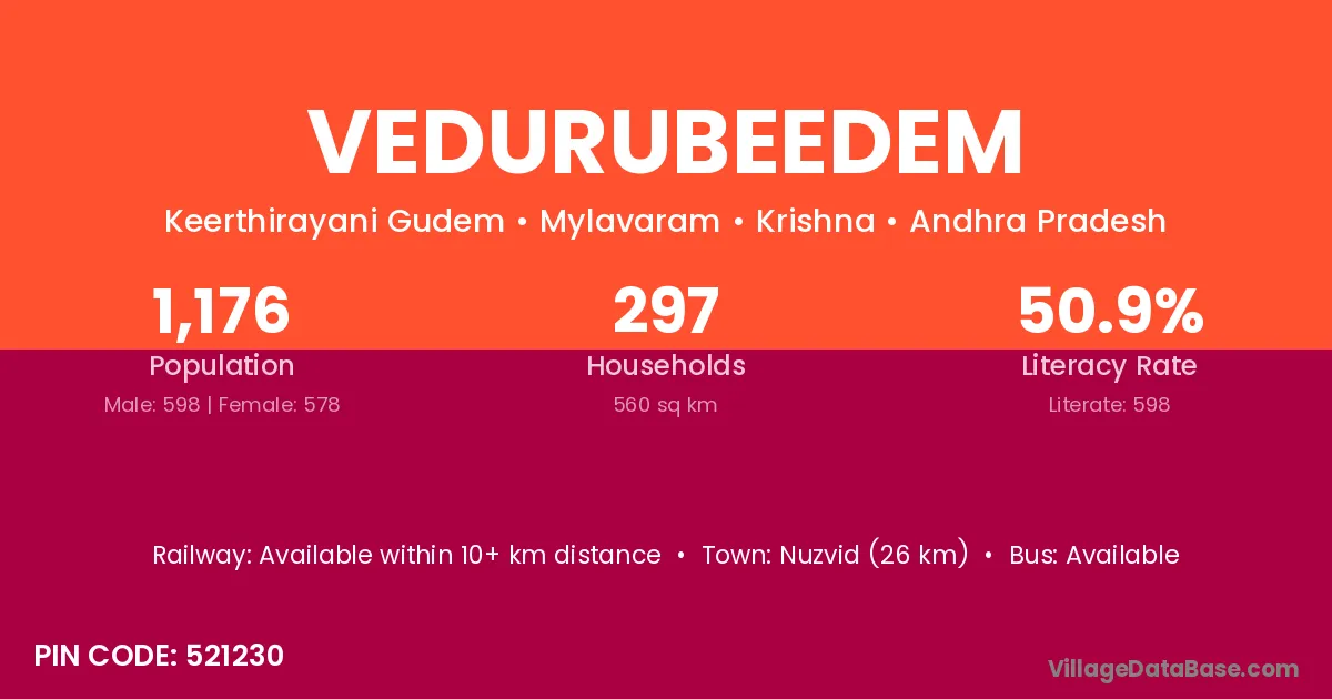 Vedurubeedem village has a total population of 1,176 people, of which 598 are males and 578 are females.