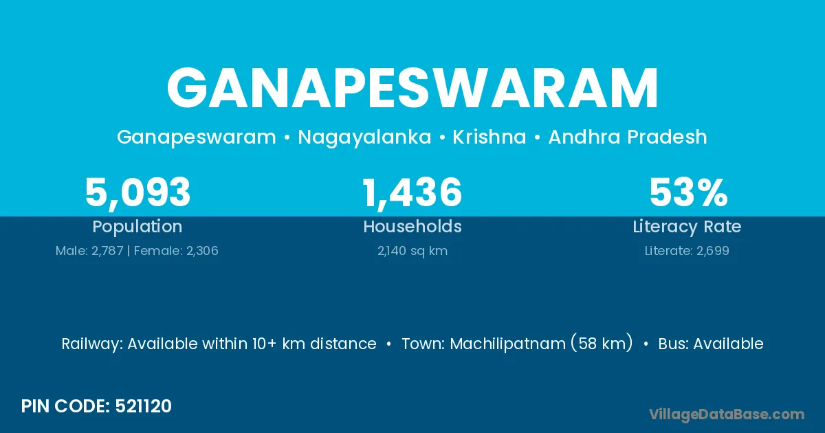 Machilipatnam (58 km) is the nearest town to Ganapeswaram village for major economic activities and is located approximately 58 km away.