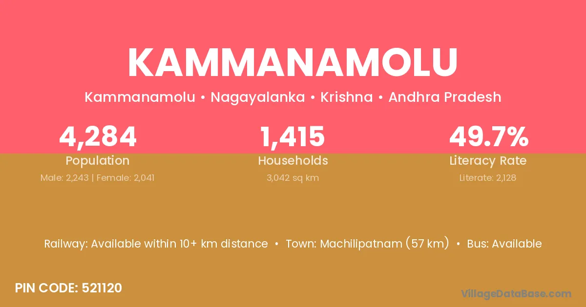 Kammanamolu village has a total population of 4,284 people, of which 2,243 are males and 2,041 are females.
