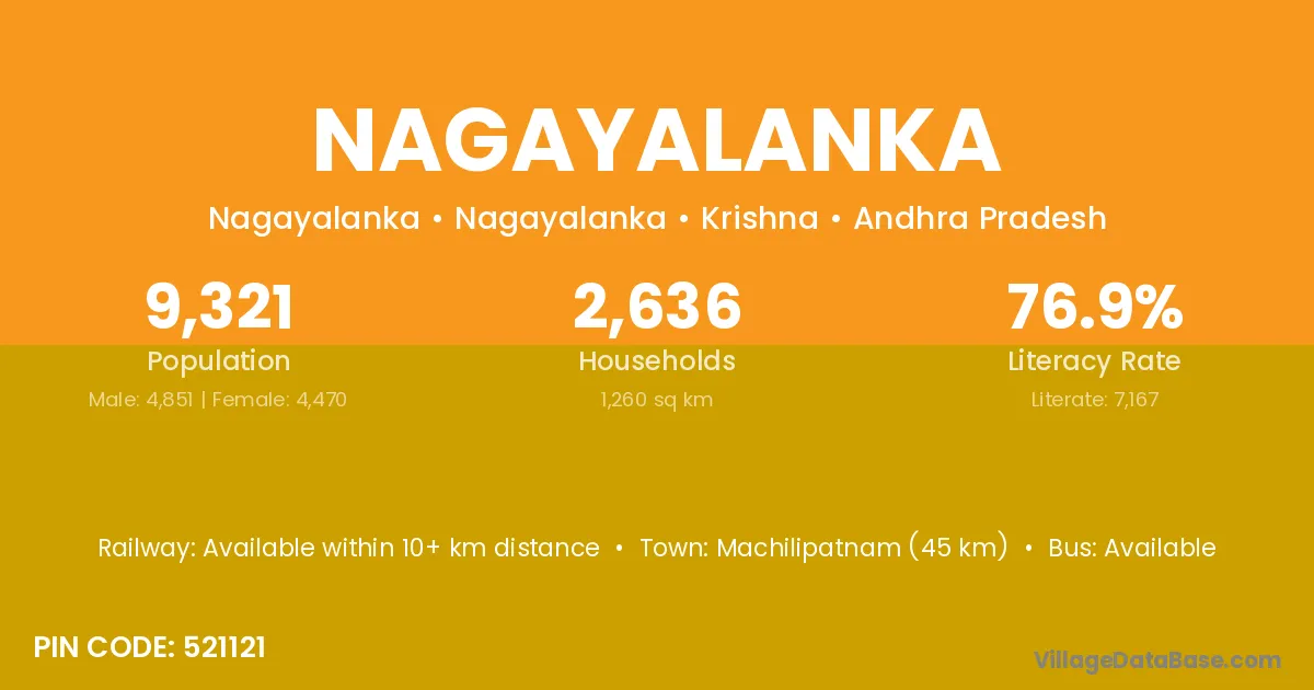 Nagayalanka village has a total population of 9,321 people, of which 4,851 are males and 4,470 are females.