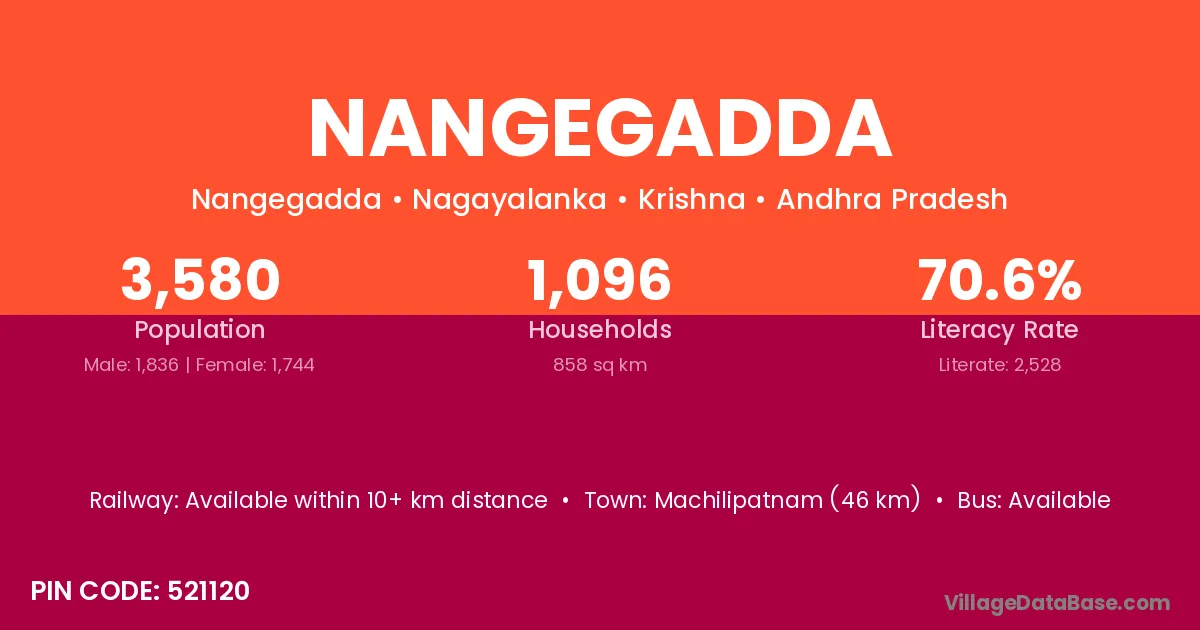 Machilipatnam (46 km) is the nearest town to Nangegadda village for major economic activities and is located approximately 46 km away.