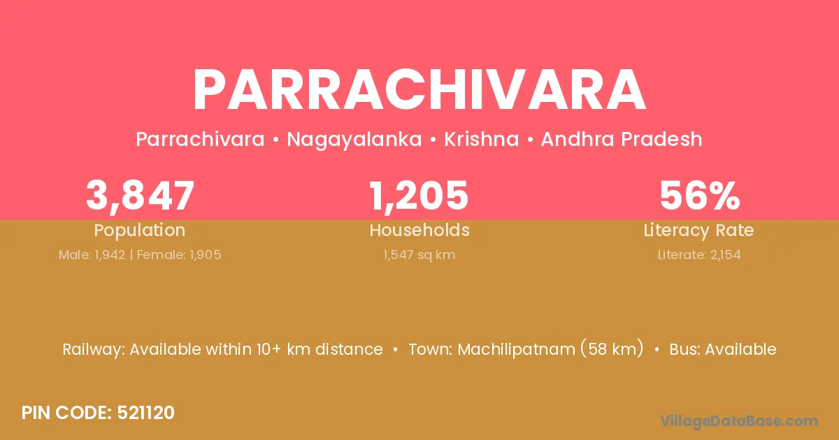 Machilipatnam (58 km) is the nearest town to Parrachivara village for major economic activities and is located approximately 58 km away.