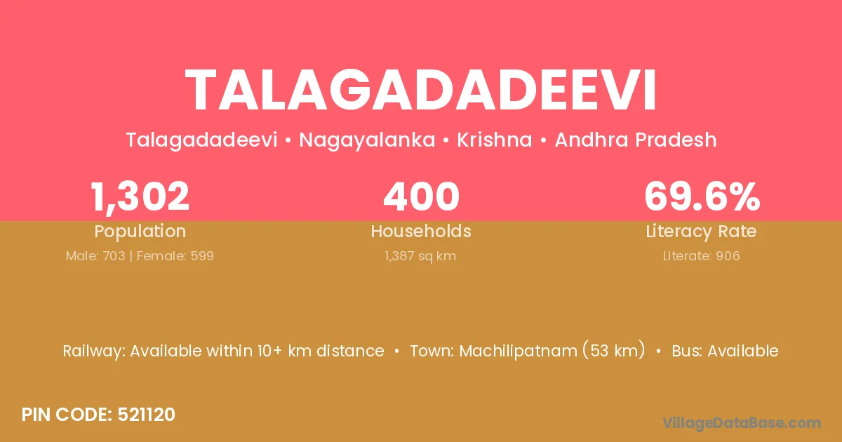 Talagadadeevi village has a total population of 1,302 people, of which 703 are males and 599 are females.