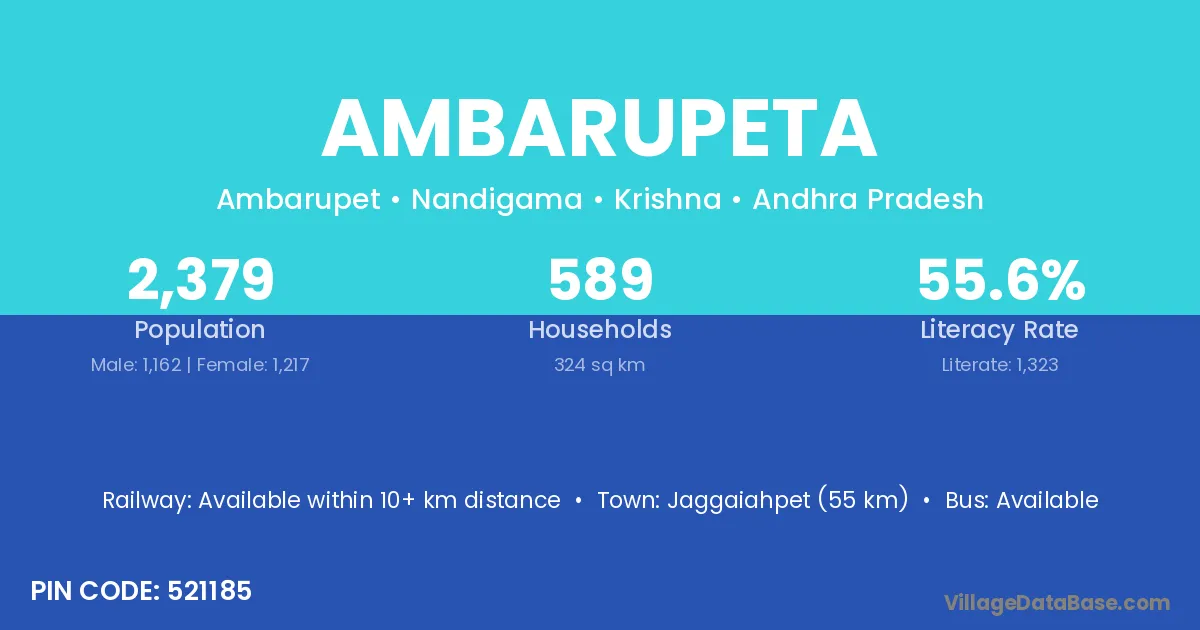 Jaggaiahpet (55 km) is the nearest town to Ambarupeta village for major economic activities and is located approximately 55 km away.