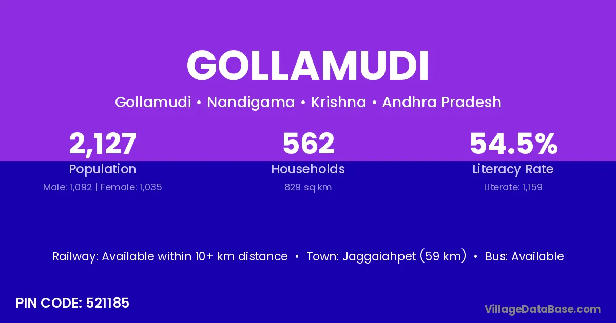 Gollamudi village has a total population of 2,127 people, of which 1,092 are males and 1,035 are females.