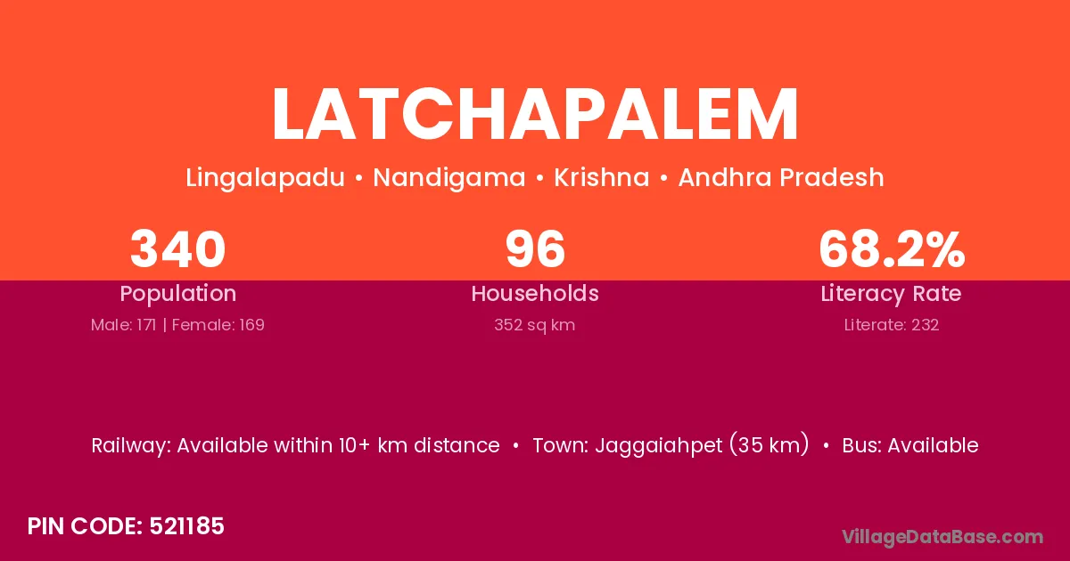 Jaggaiahpet (35 km) is the nearest town to Latchapalem village for major economic activities and is located approximately 35 km away.