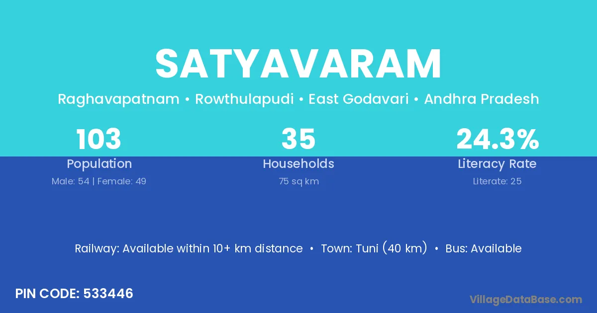 Jaggaiahpet (33 km) is the nearest town to Satyavaram village for major economic activities and is located approximately 33 km away.