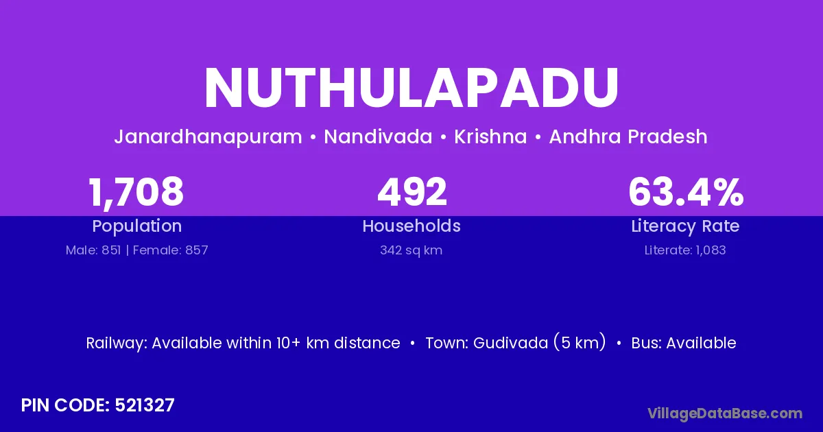Gudivada (5 km) is the nearest town to Nuthulapadu village for major economic activities and is located approximately 5 km away.