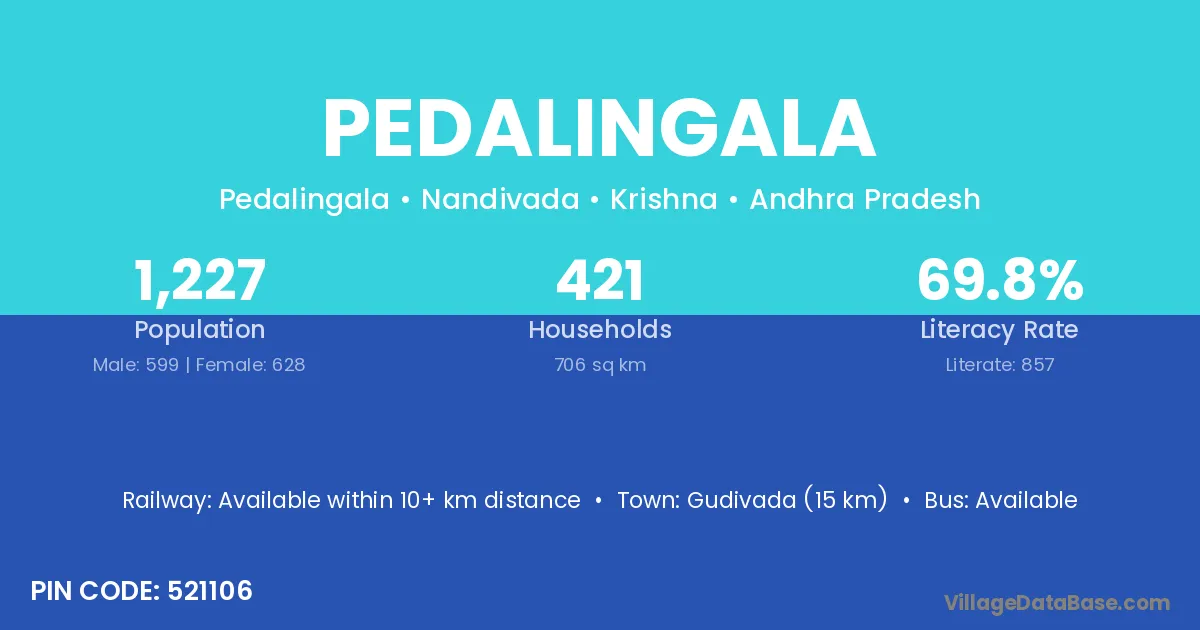 Gudivada (15 km) is the nearest town to Pedalingala village for major economic activities and is located approximately 15 km away.