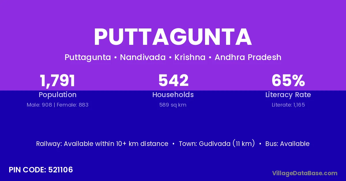 Gudivada (11 km) is the nearest town to Puttagunta village for major economic activities and is located approximately 11 km away.