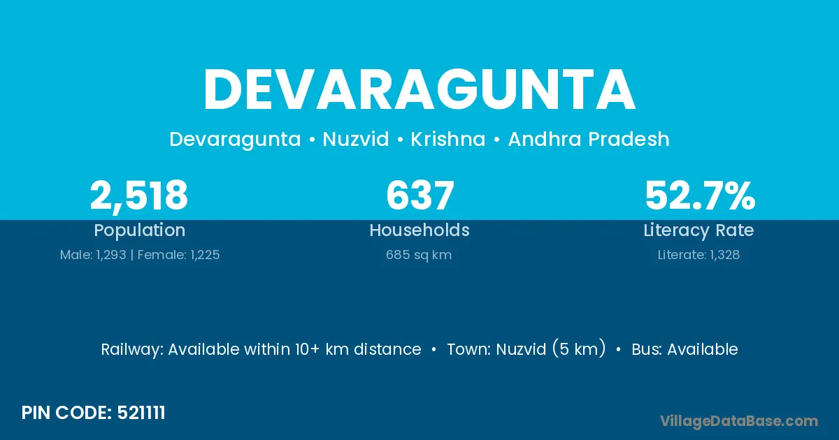 Nuzvid (5 km) is the nearest town to Devaragunta village for major economic activities and is located approximately 5 km away.