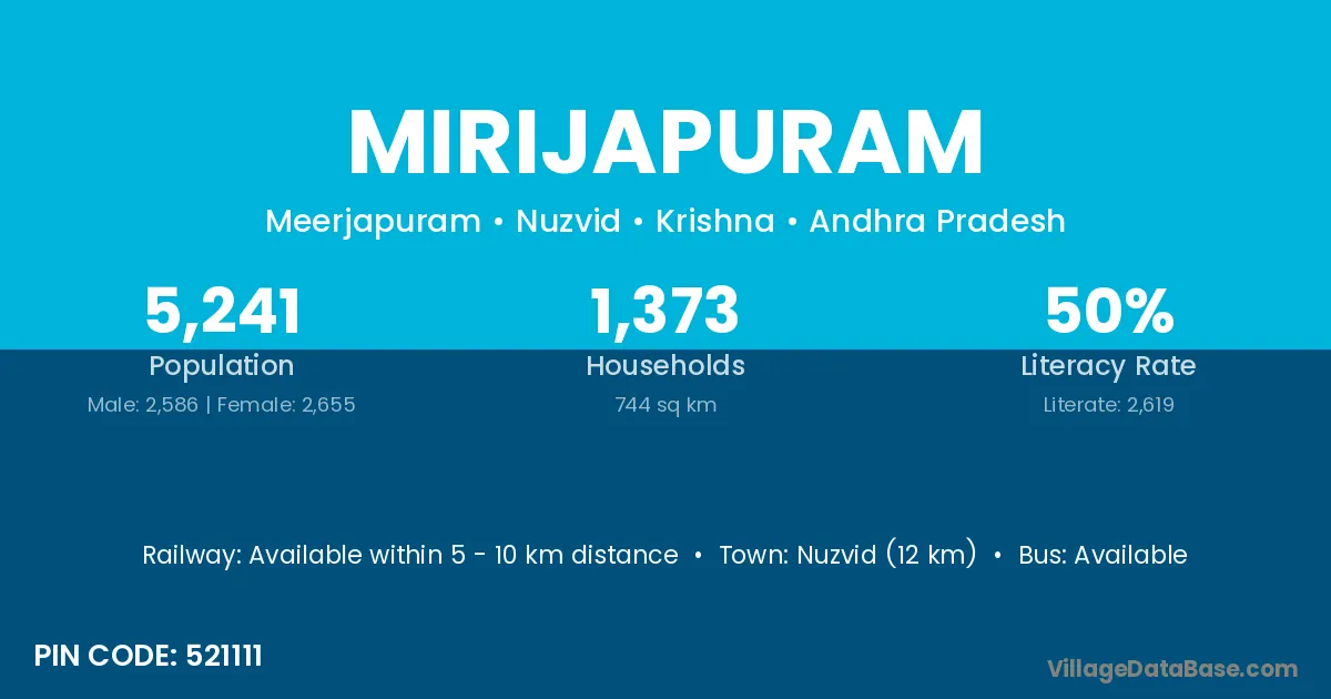 Nuzvid (12 km) is the nearest town to Mirijapuram village for major economic activities and is located approximately 12 km away.