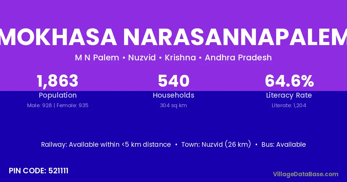 Nuzvid (26 km) is the nearest town to Mokhasa Narasannapalem village for major economic activities and is located approximately 26 km away.