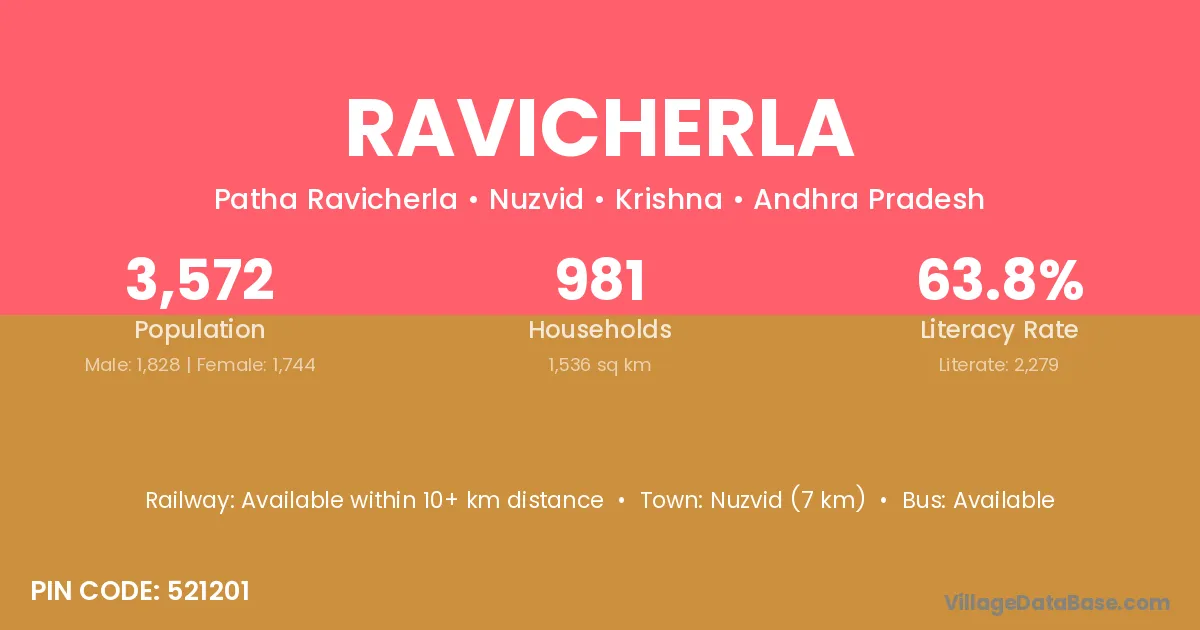 Nuzvid (7 km) is the nearest town to Ravicherla village for major economic activities and is located approximately 7 km away.