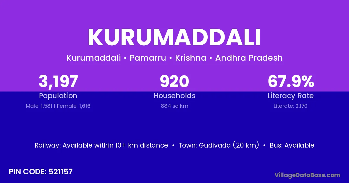 Gudivada (20 km) is the nearest town to Kurumaddali village for major economic activities and is located approximately 20 km away.