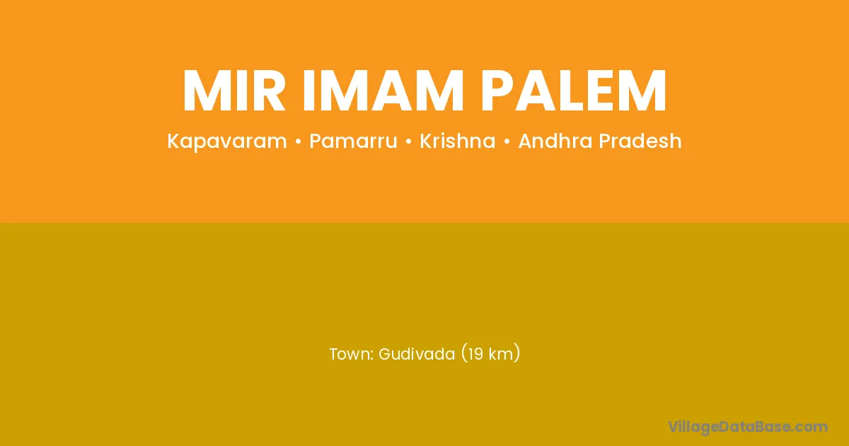 Gudivada (19 km) is the nearest town to Mir Imam Palem village for major economic activities and is located approximately 19 km away.