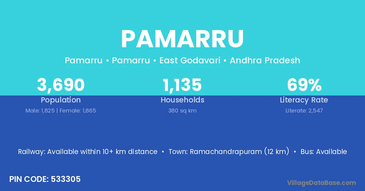 Gudivada (12 km) is the nearest town to Pamarru village for major economic activities and is located approximately 12 km away.