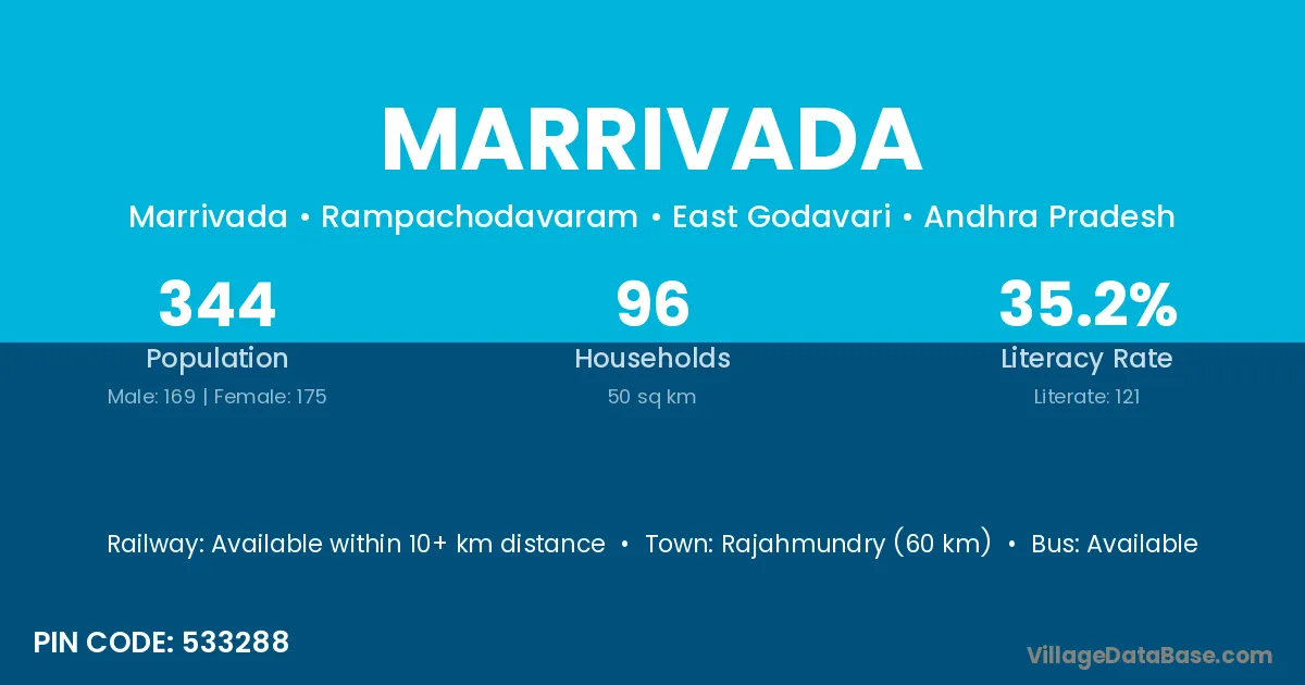 The literacy rate of Marrivada village is 62.49%. Male literacy stands at 67.20% and female literacy at 57.91%.