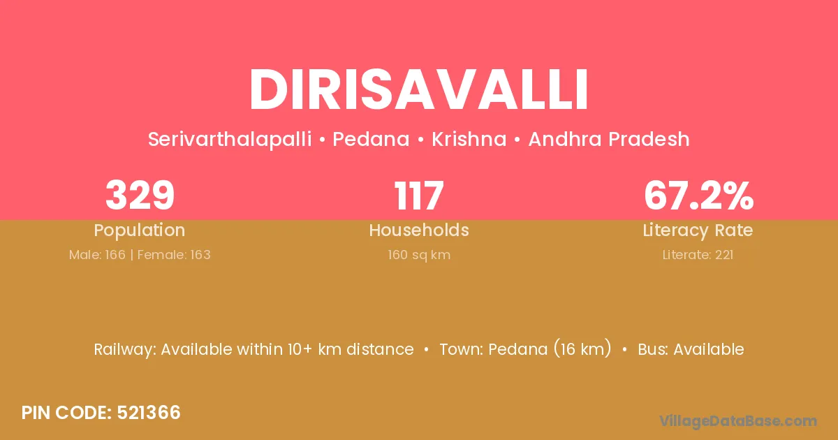 Pedana (16 km) is the nearest town to Dirisavalli village for major economic activities and is located approximately 16 km away.