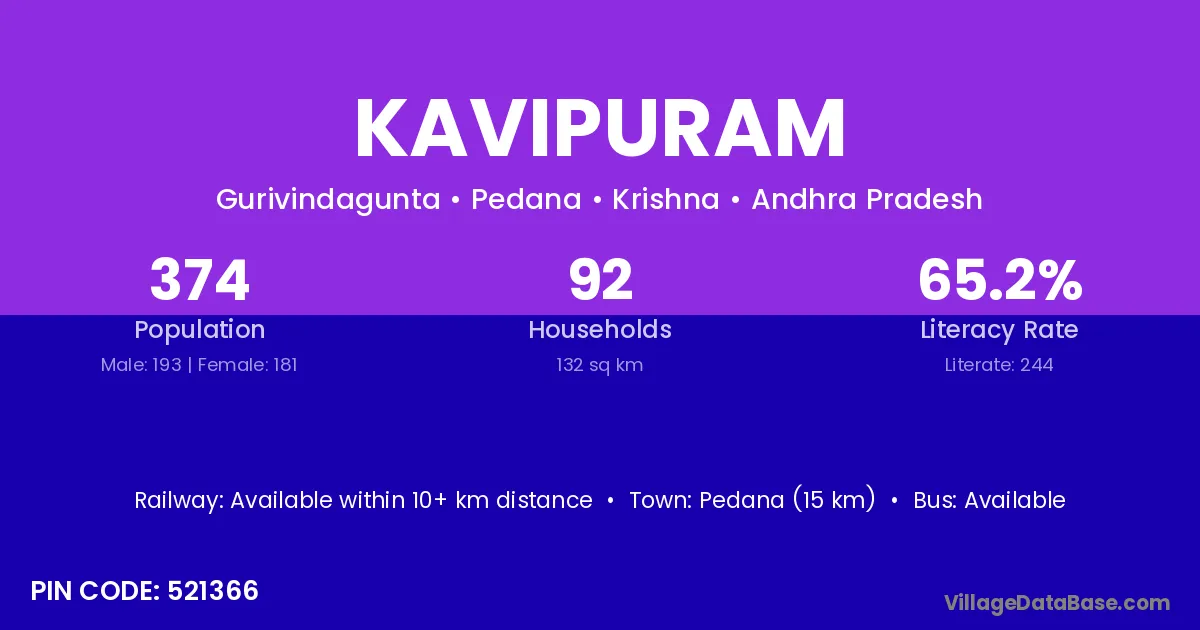 Pedana (15 km) is the nearest town to Kavipuram village for major economic activities and is located approximately 15 km away.