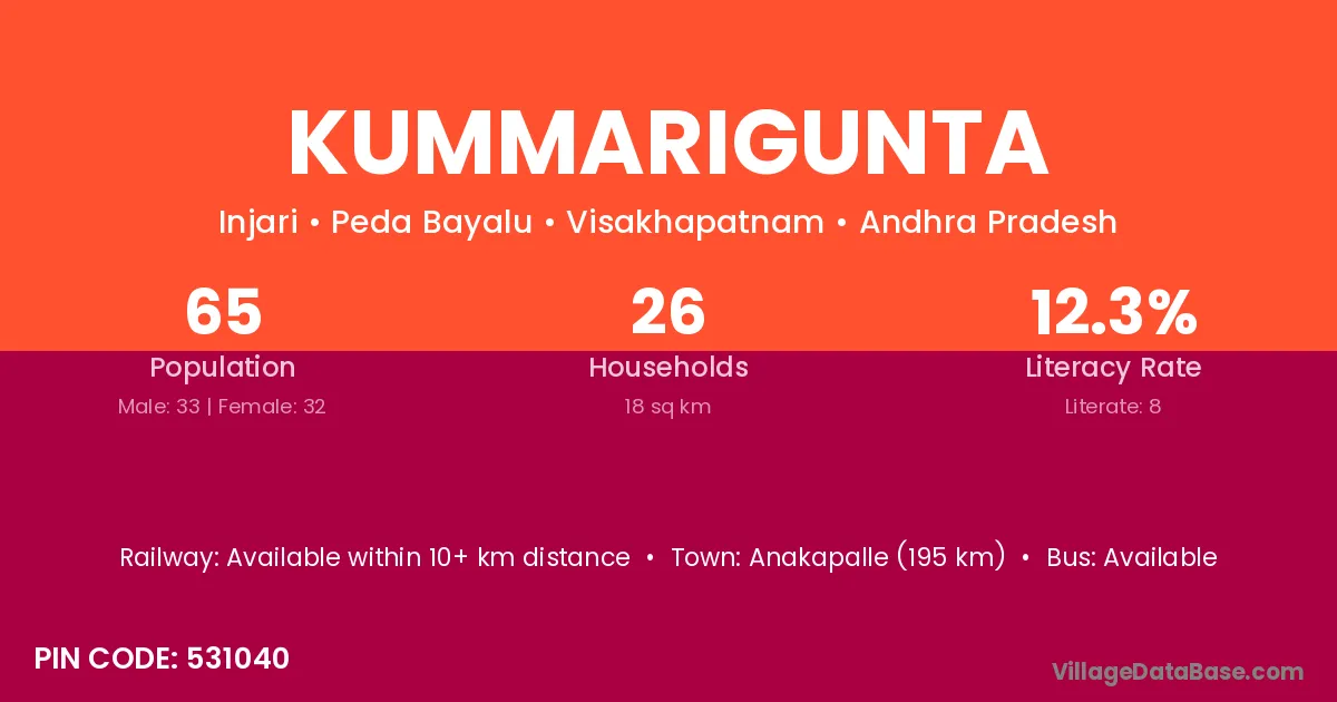 Pedana (12 km) is the nearest town to Kummarigunta village for major economic activities and is located approximately 12 km away.