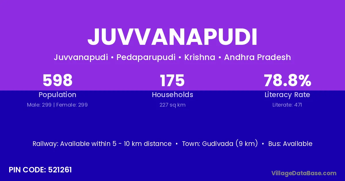 Juvvanapudi village has a total population of 598 people, of which 299 are males and 299 are females.