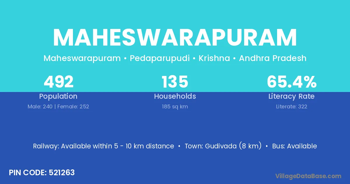Gudivada (8 km) is the nearest town to Maheswarapuram village for major economic activities and is located approximately 8 km away.