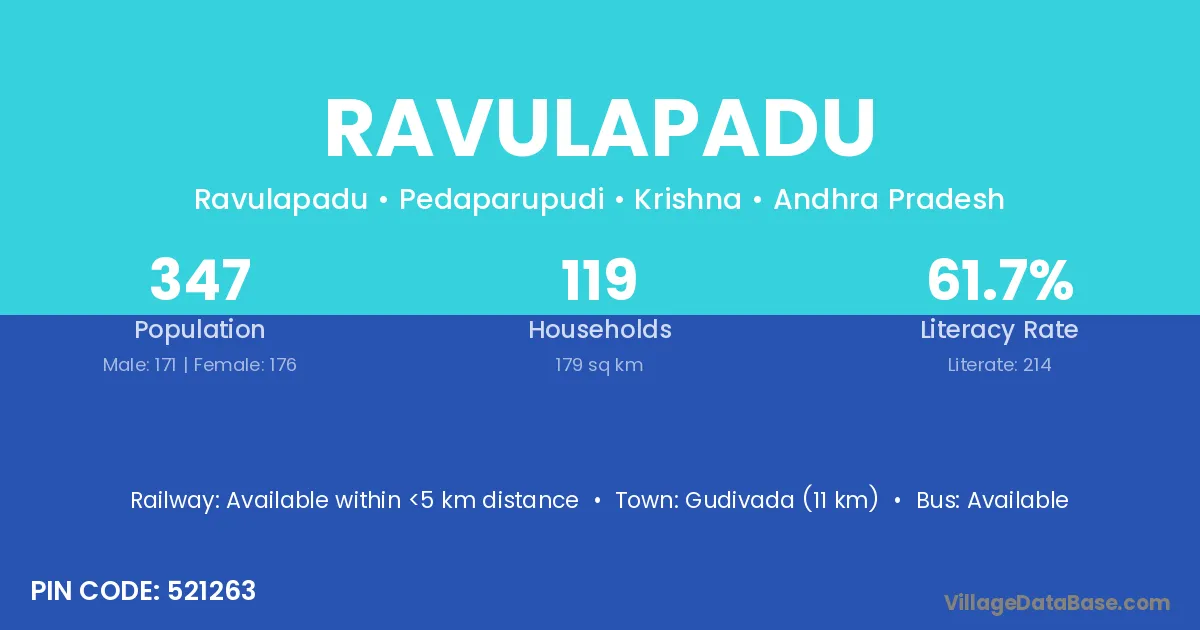 Gudivada (11 km) is the nearest town to Ravulapadu village for major economic activities and is located approximately 11 km away.