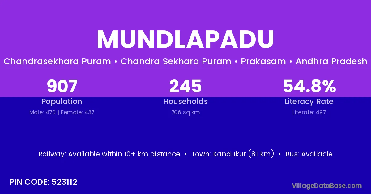 Jaggaiahpet (15 km) is the nearest town to Mundlapadu village for major economic activities and is located approximately 15 km away.