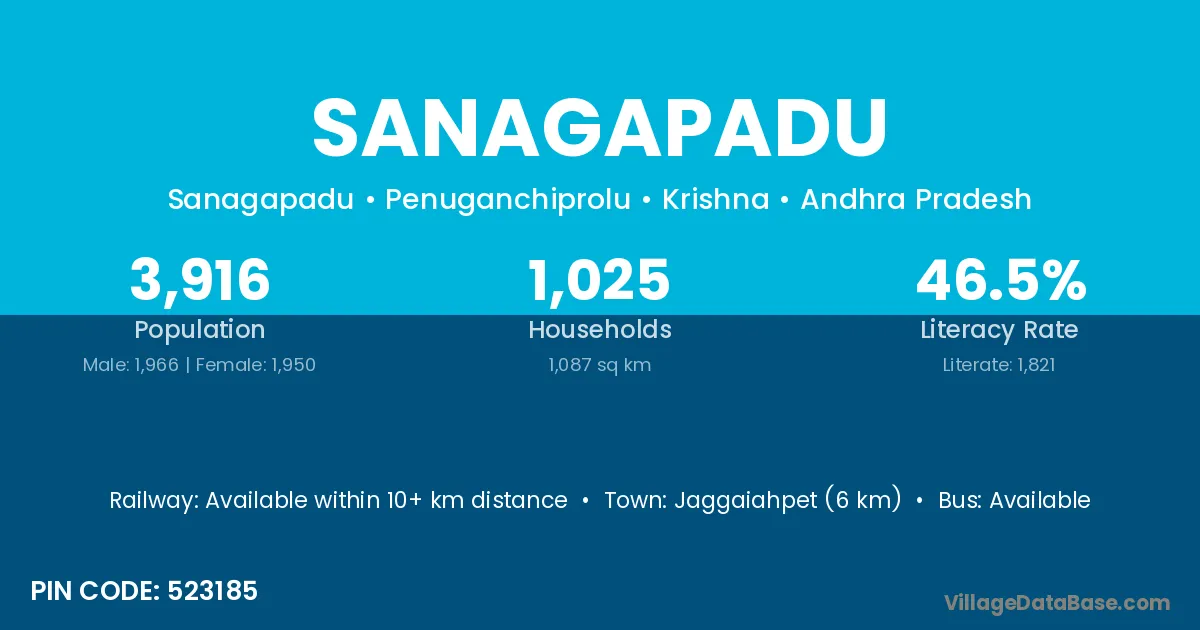 Jaggaiahpet (6 km) is the nearest town to Sanagapadu village for major economic activities and is located approximately 6 km away.