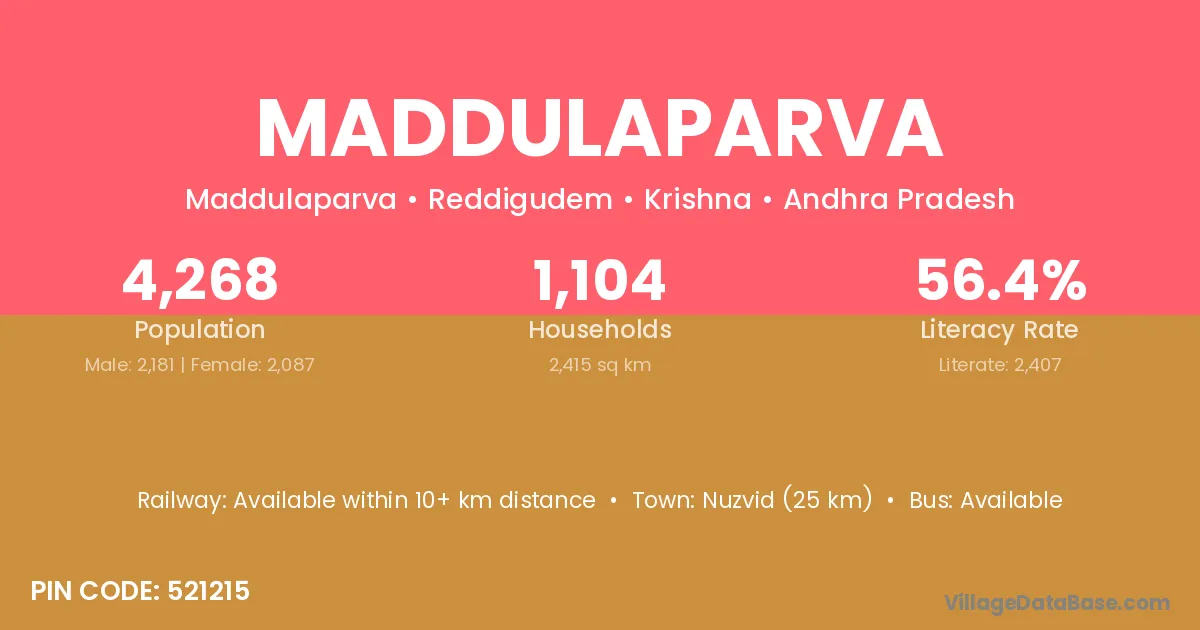 Nuzvid (25 km) is the nearest town to Maddulaparva village for major economic activities and is located approximately 25 km away.