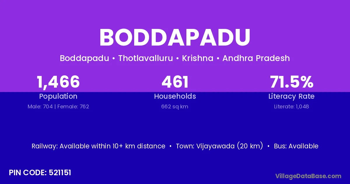 Vijayawada (20 km) is the nearest town to Boddapadu village for major economic activities and is located approximately 20 km away.