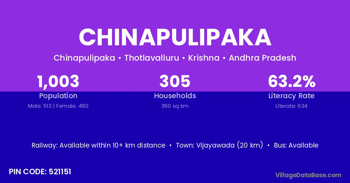 Chinapulipaka village has a total population of 1,003 people, of which 513 are males and 490 are females.