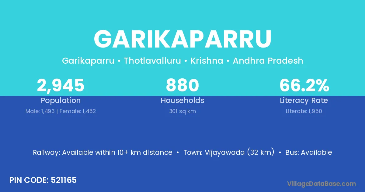 Garikaparru village has a total population of 2,945 people, of which 1,493 are males and 1,452 are females.