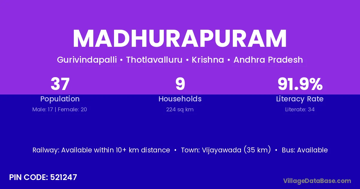 Vijayawada (35 km) is the nearest town to Madhurapuram village for major economic activities and is located approximately 35 km away.