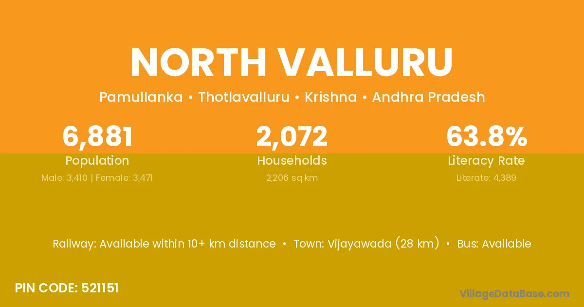 Vijayawada (28 km) is the nearest town to North Valluru village for major economic activities and is located approximately 28 km away.